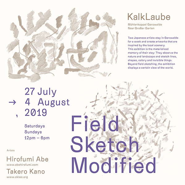 Two Japanese artists stay in Gerswalde for a week and create artworks that are inspired by the local scenery. This exhibition is the materialized memory of their stay: They observe the nature and landscape and sketch lines, shapes, colors and invisible things. Beyond field sketching, the exhibition displays a certain view of the world.