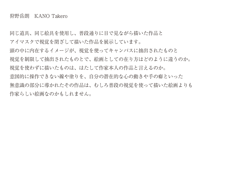 また、作家は展示期間中しばしばこの ''喫茶店'' を訪れ、隣の席で絵を描く人として、他者の意識に浸透する。Live「浸透深度」 青木隼人(音楽)x 狩野岳朗(ペインティング)x nicolas(料理)
